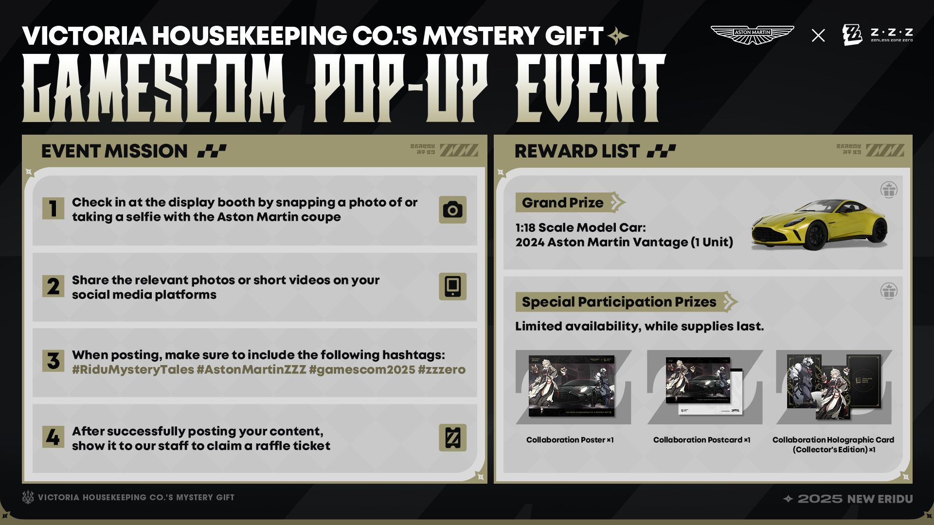 La celebrazione si estenderà anche online. I fan di tutto il mondo potranno partecipare a un concorso globale sui social media per vincere un modellino in scala 1:18, realizzato a mano con il design personalizzato di Victoria Housekeeping Co., un pezzo da collezione imperdibile per gli appassionati di auto e videogiochi. Ulteriori informazioni saranno pubblicate sugli account X ufficiali @ZZZ_EN e @astonmartin.